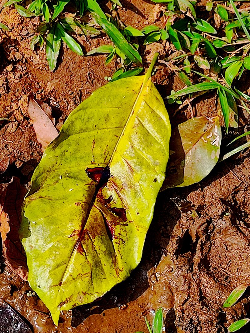 ഇതിനിടെ കൂട്ടത്തിലൊരാള്, ബ്രൗണ് നിറമുള്ള ചെളിയില് കിടക്കുന്ന കടുംമഞ്ഞ നിറത്തിലുള്ള ഒരു ഇലയുടെ ഭംഗി ഫോട്ടോയില് പകര്ത്താനായി ക്യാമറയും കൊണ്ട് ചെന്നു.