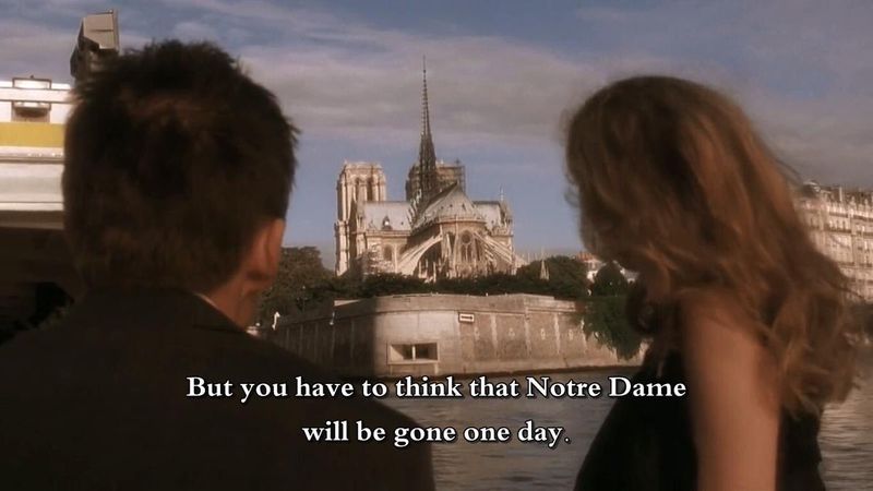 പാരിസിലെ നോത്രദാം പള്ളിയിൽ ഒരു തീപ്പിടുത്തം, അല്ലെങ്കിൽ കാര്യമായ എന്തെങ്കിലും ഒരപകടം ഇന്നല്ലെങ്കിൽ നാളെ ഉണ്ടാവും എന്നത് നേരത്തേ കൂട്ടി പ്രവചിക്കപ്പെട്ടിരുന്നു. ഇന്നും ഇന്നലെയുമല്ല, ഇന്നേക്കു പതിനഞ്ചു വർഷം മുമ്പിറങ്ങിയ 'Before Sunset' എന്ന ചിത്രത്തിലായിരുന്നു ആ പ്രവചനം.