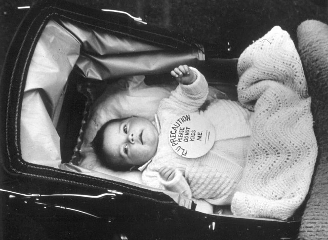 കൊവിഡിന്റെ സമയത്തുള്ള ഏറ്റവും വലിയ മുന്കരുതലാണ് പരസ്പരം സ്പര്ശിക്കാതിരിക്കുക എന്നത്. വര്ഷങ്ങള്ക്ക് മുമ്പുതന്നെ ആളുകള് ഇത്തരം കാര്യങ്ങള് പ്രാവര്ത്തികമാക്കിയിരുന്നു. സ്പര്ശിക്കാതിരിക്കുക, ചുംബിക്കാതിരിക്കുക ഇവയൊക്കെ രോഗവ്യാപനത്തെ തടയാനുതകുമെന്നും അന്നുള്ളവര് വിശ്വസിച്ചിരുന്നു. 1939 -ല് എടുത്ത ഒരു ചിത്രത്തില് ഒരു കുഞ്ഞിന്റെ കുപ്പായത്തിലായി 'ഫ്ലൂ മുന്കരുതല്: പ്ലീസ് എന്നെ ഉമ്മവയ്ക്കരുത്' എന്നെഴുതിയിരിക്കുന്നതായി കാണാം.