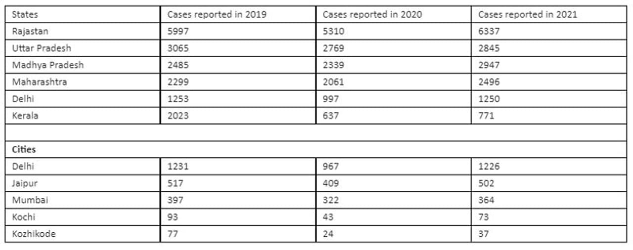 2022 ജനുവരി മുതൽ ജൂലൈ വരെ ദില്ലിയിൽ മാത്രം 7887 ബലാൽസംഗകേസുകൾ ( ദില്ലി പൊലീസിന്റെ കണക്ക് പ്രകാരം PTI 2022 ഓഗസ്റ്റ് 22ന് റിപ്പോർട്ട് ചെയ്തത് )
