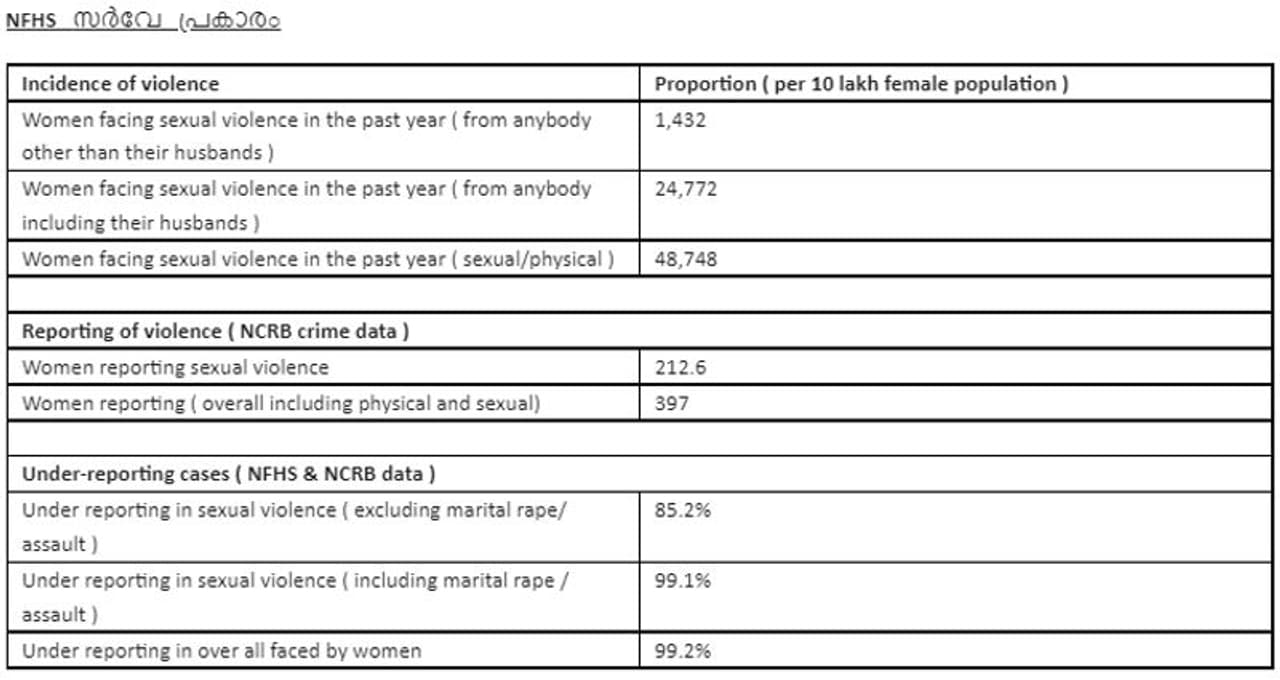 ഇനി, ഇതിനെക്കാളൊക്കെ ഞെട്ടിക്കുന്നത് 2015-16 വർഷങ്ങളിൽ നടന്ന Natonal Family Health Survey കണക്കുകളാണ്. സർവേ പ്രകാരം 99.1 ശതമാനം ലൈംഗിക പീഡന കേസുകളും റിപ്പോർട്ട് ചെയ്യപ്പെടുന്നില്ല.മിക്ക കേസുകളിലും ഇരയുടെ ഭർത്താവാണ് പീഡകനെന്നും ചേര്ത്ത് വായിക്കണം. 2015, 2016 വർഷങ്ങളിൽ 7 ലക്ഷം ഇന്ത്യന് സ്ത്രീകളിൽ നടത്തിയ സര്വേ പറയുന്നത് ഒരു ശരാശരി ഇന്ത്യൻ സ്ത്രീ, അന്യ പുരുഷൻമാരിൽ നിന്നും ഭർത്താവിനാൽ ലൈംഗിക പീഡനത്തിന് ഇരയാവാനുള്ള സാധ്യത 17 മടങ്ങാണെന്നാണ്. Marital rape മാറ്റി നിർത്തിയാൽ പോലും 15% ബലാൽസംഗങ്ങൾ മാത്രമേ റിപ്പോർട്ട് ചെയ്യപ്പെടുന്നൊള്ളൂ എന്നും കണക്കുകള് പറയുന്നു.