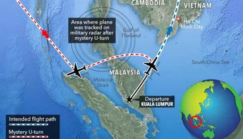 സ്ട്രൈറ്റ് ഓഫ് മല്ലാക്കയ്ക്ക് മുകളിലൂടെ തെക്കുപടിഞ്ഞാറെ ദിശയിലേക്ക് പറന്ന ശേഷം, വിമാനം അവസാനമായി ഒന്ന് തിരിഞ്ഞ് തെക്കോട്ട് പോവുന്നു. ഇങ്ങനെ തിരിഞ്ഞു എന്നതും, തുടർന്ന് ആ വിമാനം പോയ വഴിയും ഉപഗ്രഹവുമായി വിമാനം നടത്തിയ സമ്പർക്കത്തിൽ നിന്നും വിശകലനം ചെയ്തു കണ്ടെത്തിയതാണ്.