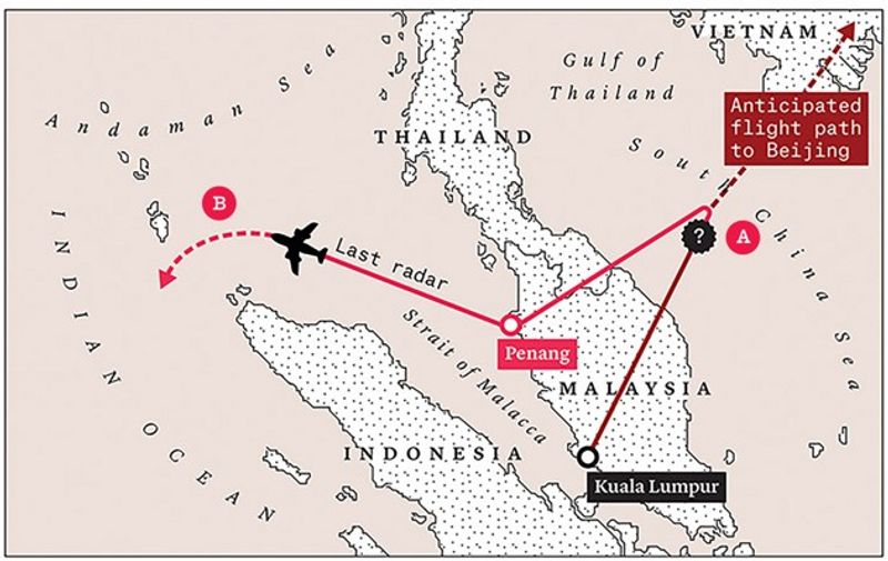 A— 1:21 a.m.മാർച്ച് 8, 2014: ദക്ഷിണ ചൈനാ സമുദ്രത്തിനു മുകളിൽ, മലേഷ്യയ്ക്കും വിയറ്റ്നാമിനും ഇടയിൽ എവിടെയോ വെച്ച്, MH370 എയർ ട്രാഫിക് കണ്ട്രോൾ റഡാറിൽ നിന്നും മഞ്ഞ് പോവുന്നു. അതിനു ശേഷം അത് തെക്കുപടിഞ്ഞാറെ ദിശയിലേക്ക് , മലായ് പെനിൻസുലയിലേക്ക് പോവുന്നു.