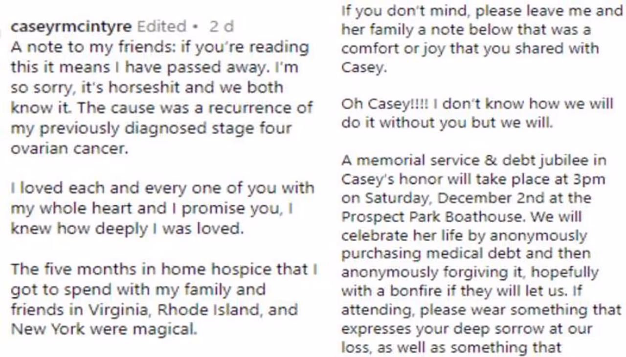 അവളുടെ കുറിപ്പിൽ എഴുതിയിരുന്നത് ഇങ്ങനെയാണ്, “എന്റെ സുഹൃത്തുക്കളുടെ ശ്രദ്ധയ്ക്ക്: നിങ്ങൾ ഇത് വായിക്കുകയാണെങ്കിൽ അതിന്റെ അർത്ഥം ഞാൻ മരിച്ചു എന്നാണ്. നേരത്തെ കണ്ടെത്തിയ സ്റ്റേജ് ഫോർ ഒവേറിയൻ കാൻസറാണ് അതിന് കാരണം. ഞാൻ നിങ്ങളെ ഓരോരുത്തരെയും പൂർണമായ ഹൃദയത്തോടെ തന്നെ സ്നേഹിച്ചു, ഞാൻ നിങ്ങളോട് പ്രോമിസ് ചെയ്യുന്നു, എത്രമാത്രം ആഴത്തിലാണ് ഞാൻ സ്നേഹിക്കപ്പെട്ടത് എന്നും എനിക്കറിയാം. വിർജീനിയ, റോഡ് ഐലൻഡ്, ന്യൂയോർക്ക് എന്നിവിടങ്ങളിലുള്ള ഹോസ്പിസ് കെയറുകളിൽ കുടുംബത്തോടും സുഹൃത്തുക്കളോടും ഒപ്പം ചെലവഴിക്കാൻ എനിക്ക് ലഭിച്ച അഞ്ച് മാസം ശരിക്കും മാന്ത്രികമായിരുന്നു.“