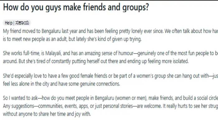 അതിൽ ഒരു യുവതി പറയുന്നത് ബെംഗളൂരു പോലെ തിരക്കുള്ള ഒരു നഗരത്തിൽ ഒരു യഥാർത്ഥ സുഹൃത്തിനെ കണ്ടെത്തുക എന്നത് എത്രമാത്രം പ്രയാസമുള്ള കാര്യമാണ് എന്നാണ്. കഴിഞ്ഞ വർഷം നഗരത്തിലെത്തിയ തന്റെ സുഹൃത്തിന് വേണ്ടിയാണ് യുവതിയുടെ പോസ്റ്റ്. നിങ്ങളൊക്കെ എങ്ങനെയാണ് സുഹൃത്തുക്കളെയും ഗ്രൂപ്പുകളെയും ഉണ്ടാക്കുന്നത് എന്നാണ് യുവതി ചോദിക്കുന്നത്. ഒപ്പം തന്റെ സുഹൃത്ത് കൂട്ടുകാരെ ഉണ്ടാക്കാൻ ബുദ്ധിമുട്ടുകയാണ് എന്നും പോസ്റ്റിൽ പറയുന്നു.