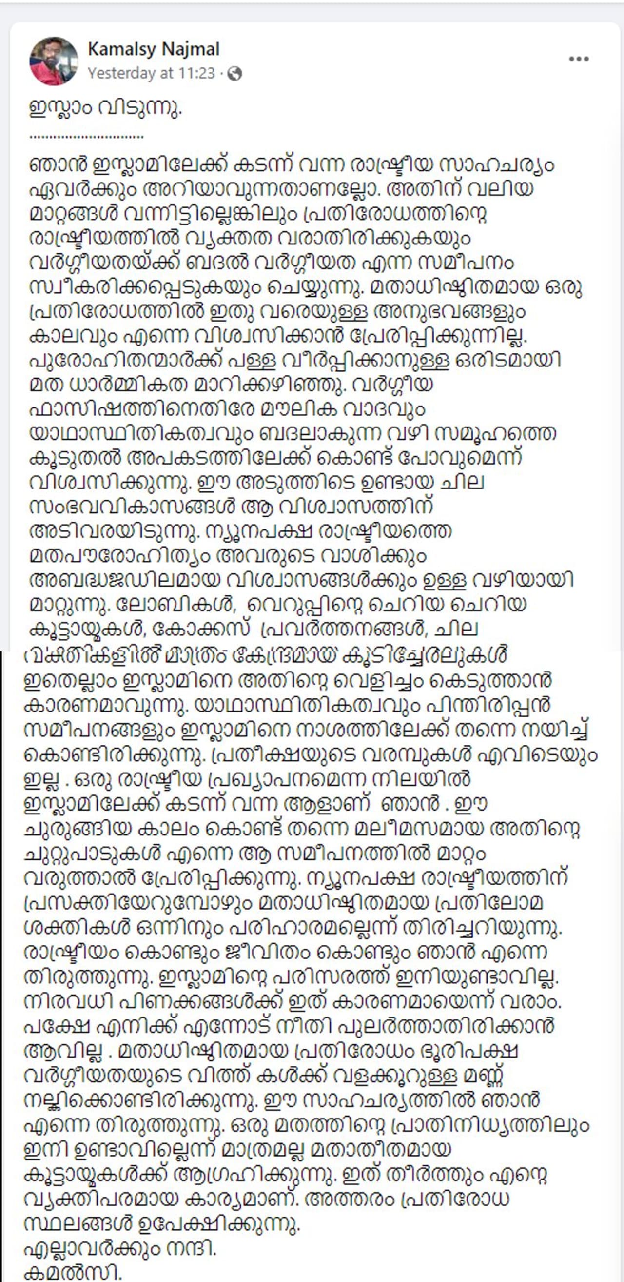 അത് കഴിഞ്ഞ് രണ്ടു വര്ഷത്തിനു ശേഷമാണ് ഇപ്പോള് താന് ഇസ്ലാം മതം വിടുന്നതായി കമല് സി ഫേസ്ബുക്കിലൂടെ തന്നെ വ്യക്തമാക്കിയത്. അദ്ദേഹത്തിന്റെ ഫേസ്ബുക്ക് പോസ്റ്റ് ഇതാണ്:
