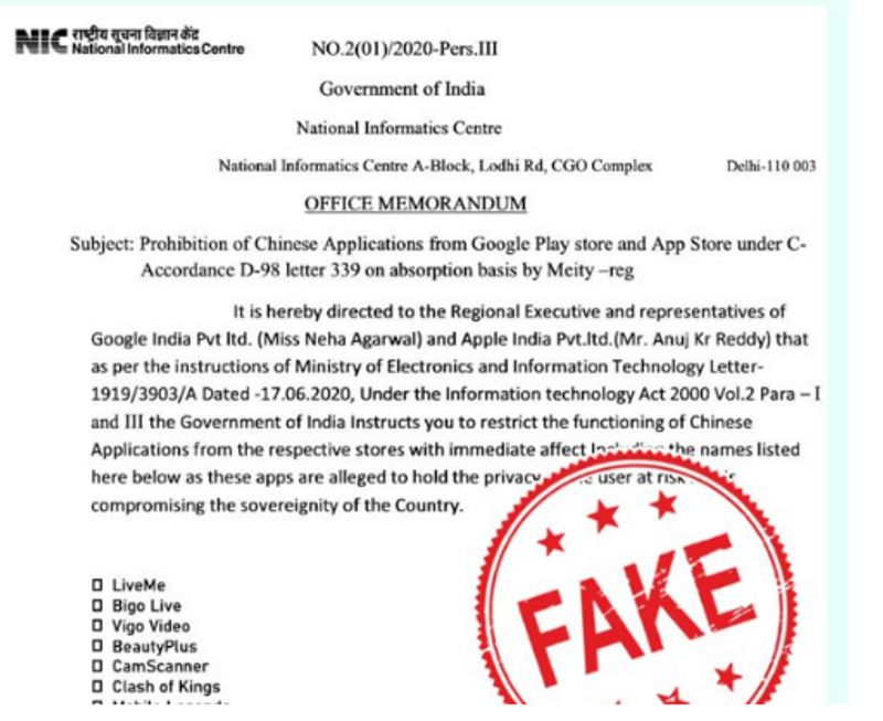 കേന്ദ്ര ഇലക്ട്രോണിക് ആന്റെ ഐടി മന്ത്രാലയത്തിന് കീഴിലുള്ള നാഷണല് ഇന്ഫര്മാറ്റിക്ക് സെന്റര് ആപ്പിളിന്റെ ആപ്പ് സ്റ്റോര്, ഗൂഗിളിന്റെ ആപ്ലിക്കേഷന് സ്റ്റോറായ പ്ലേ സ്റ്റോര് എന്നിവയില് നിന്നും ചൈനീസ് ആപ്പുകള് നീക്കം ചെയ്യണം എന്ന് ആവശ്യപ്പെട്ട് ഉത്തരവിറക്കി. ഇന്ത്യയിലെ ഗൂഗിളിന്റെയും ആപ്പിളിന്റെ പ്രദേശിക അധികാരികളോടാണ് നിര്ദേശം എന്നാണ് സോഷ്യല് മീഡിയയില് പ്രചരിക്കുന്ന ഒരു ഓഡറിന്റെ കോപ്പി എന്ന് തോന്നിക്കുന്ന കടലാസില് പറയുന്നത്. “restrict the functioning of Chinese applications from the respective stores with immediate effect”.എന്ന് ഓഡറില് എഴുതിയതായും പറയുന്നു. വി മാറ്റ്, ടിക്ടോക്ക്, വിഗോ ലൈവ്, ലൈവ് മീ, ബിന്ഗോ ലൈവ്, ബ്യൂട്ടി പ്ലസ്, ക്യാം സ്കാനര്, ക്ലബ് ഫാക്ടറി,ഷെയിന്, റോമീ,ആ്പപ്പ് ലോക്ക് എന്നീ ആപ്പുകള് നീക്കം ചെയ്യണം എന്നാണ് പ്രചരിക്കുന്നത്. ഈ ആപ്പുകള് സുരക്ഷയ്ക്കും, സ്വകാര്യതയ്ക്കും, രാജ്യത്തിന്റെ പരമാധികാരത്തിനും വെല്ലുവിളിയാണെന്നും പ്രചരിക്കുന്ന സന്ദേശം പറയുന്നു.