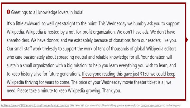 ബുദ്ധിമുട്ടുള്ള കാര്യമായതിനാല് നേരിട്ട് കാര്യത്തിലേക്ക് കടക്കാം. ലാഭമില്ലാതെ പ്രവര്ത്തിക്കുന്ന പ്രസ്ഥാനമാണ് വിക്കിപീഡിയ എന്ന് അറിയാമല്ലോ. ഞങ്ങള് പരസ്യം ചെയ്യാറില്ല അതുപോലെ ഓഹരിയുടമകളുമില്ല. വായനക്കാരില് നിന്നുള്ള സംഭാവനയാണ് വിക്കിപീഡിയയുടെ വരുമാനം. പക്ഷം പിടിക്കാതെയുള്ള വിവരങ്ങള് നിങ്ങളിലെത്തിക്കാന് വിശ്രമമില്ലാതെ ജോലി ചെയ്യുന്ന നിരവധിപ്പേര് ഞങ്ങള്ക്കൊപ്പമുണ്ട്. നിങ്ങളുടെ സംഭാവനയ്ക്ക് വലിയൊരു തരത്തില് ആ പ്രസ്ഥാനത്തെ സഹായിക്കാന് സാധിക്കും. ഭാവിതലമുറകള്ക്ക് വേണ്ടി ഈ പ്രസ്ഥാനത്തെ ജീവിപ്പിച്ച് നിര്ത്താന് അത് ആവശ്യമാണ്. ഈ കുറിപ്പ് ലഭിക്കുന്നവര് 150 രൂപ സംഭാവന നല്കാന് അപേക്ഷിക്കുന്നു. നിങ്ങളുടെ ഒരു സിനിമാ ടിക്കറ്റിന്റെ തുക മാത്രമാണ് ഞങ്ങള്ക്ക് ആവശ്യമായത്. വിക്കി പീഡിയയുടെ വളര്ച്ചക്കായി ഒരു നിമിഷം ഉപയോഗിക്കൂ, നന്ദി എന്നാണ് കുറിപ്പില് വ്യക്തമാക്കുന്നത്.