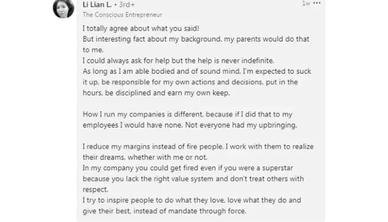 ആത്യന്തികമായി, കമ്പനി നിങ്ങളെ നിർവചിക്കുന്നത് വാക്കുകളില്ലല്ല, മറിച്ച് നിങ്ങളുടെ പ്രവൃത്തികളിലാണ് ” അദ്ദേഹം കുറിച്ചു. ഏകദേശം ഒരാഴ്ച മുമ്പാണ് ഇത് പോസ്റ്റ് ചെയ്തത്. 47,000-ലധികം പ്രതികരണങ്ങളാണ് പോസ്റ്റിന് ലഭിച്ചത്. ഇത് ഏകദേശം 4,000 തവണ ഷെയര് ചെയ്തിട്ടുണ്ട്. ഈ പോസ്റ്റ് നിലവില് ആളുകൾക്കിടയിൽ ചർച്ചയ്ക്ക് കാരണമായി കഴിഞ്ഞു. ചിലർ സിഇഒയുടെ അഭിപ്രായത്തോട് യോജിച്ചും മറ്റുള്ളവർ എതിർ അഭിപ്രായങ്ങൾ പങ്കിട്ടും രംഗത്തെത്തിയിട്ടുണ്ട്.