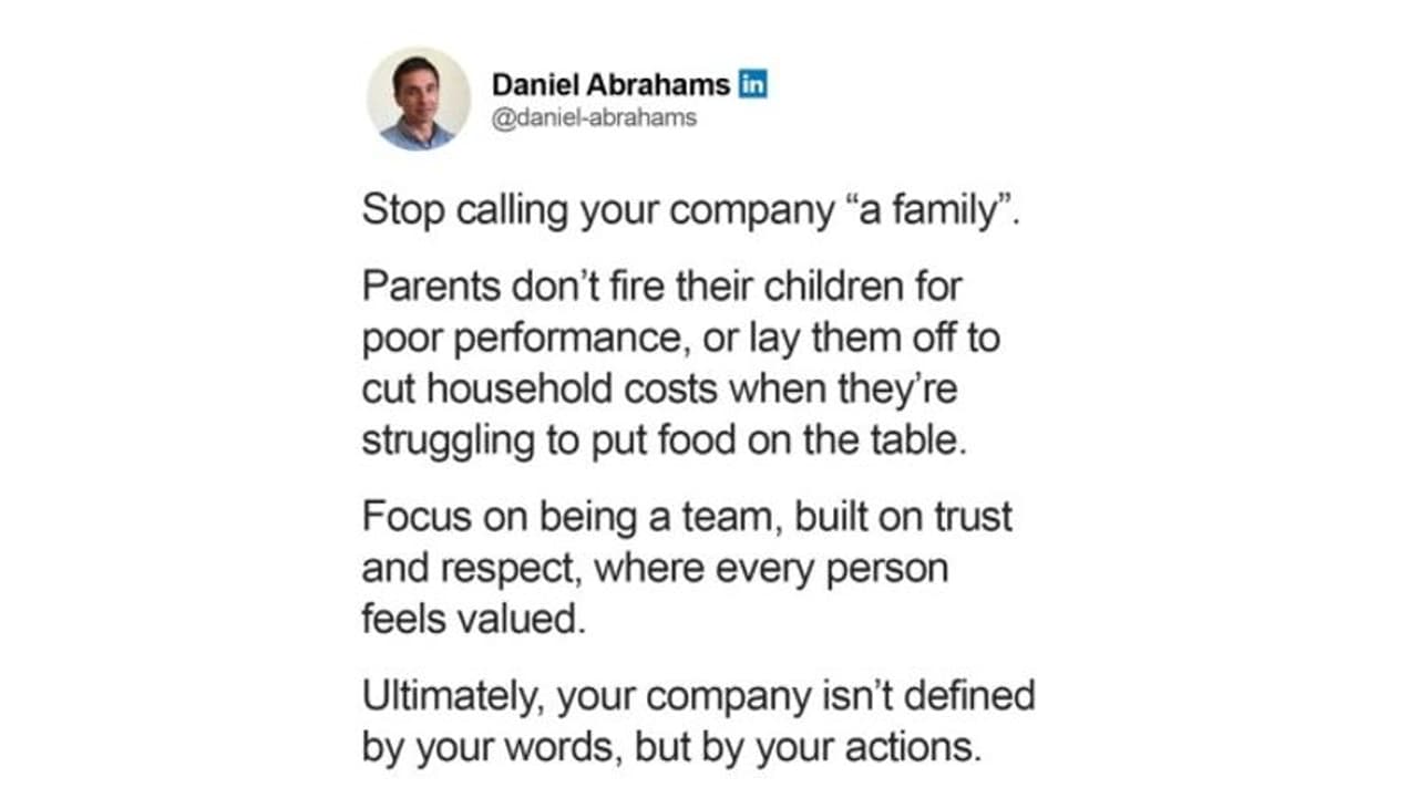 സിഡ്നി ആസ്ഥാനമായുള്ള ഡിജിറ്റൽ മീഡിയ ഏജൻസിയായ ഹസ്റ്റ്റിന്റെ സ്ഥാപകനും സിഇഒയുമായ ഡാനിയൽ എബ്രഹാംസാണ് തന്റെ ലിങ്ക്ഡ്ഇൻ പേജിലൂടെ തന്റെ കാഴ്ചപ്പാട് പങ്കിട്ടിരിക്കുന്നത്. "നിങ്ങളുടെ കമ്പനിയെ 'ഒരു കുടുംബം' എന്ന് വിളിക്കുന്നത് നിർത്തുക. മോശം പ്രകടനത്തിന്റെ പേരിൽ മാതാപിതാക്കൾ കുട്ടികളെ ജോലിയിൽ നിന്ന് പുറത്താക്കുകയോ ഭക്ഷണം വയ്ക്കാൻ പാടുപെടുമ്പോൾ വീട്ടുചെലവുകൾ കുറയ്ക്കാനായി അവരെ പിരിച്ചുവിടുകയോ ചെയ്യില്ല. ഓരോ വ്യക്തിയും വിലമതിക്കുന്നതായി തോന്നുന്ന വിശ്വാസത്തിലും ബഹുമാനത്തിലും അധിഷ്ഠിതമായ ഒരു ടീമായി മാറുന്നതിൽ ശ്രദ്ധ കേന്ദ്രീകരിക്കുക.