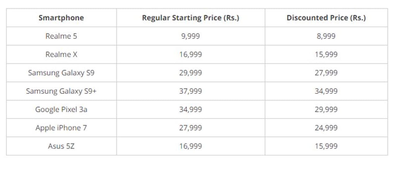 12,999 രൂപയ്ക്ക് ബേസിക് 4 ജിബി റാം 64 ജിബി സ്റ്റോറേജ് മോഡൽ റിയൽമി 5 പ്രൊ സ്മാർട്ഫോൺ വാങ്ങാനാവും. 16,999 രൂപ വിലയിൽ ലോഞ്ച് ചെയ്ത റിയൽമിയുടെ തന്നെ റിയൽമി X 14,999 രൂപയ്ക്കാണ് ലഭിക്കുക. പ്രീപെയ്ഡ് ട്രാൻസാക്ഷനിലെ 1,000 രൂപ ഓഫ് അടക്കമാണ് ഈ വില.