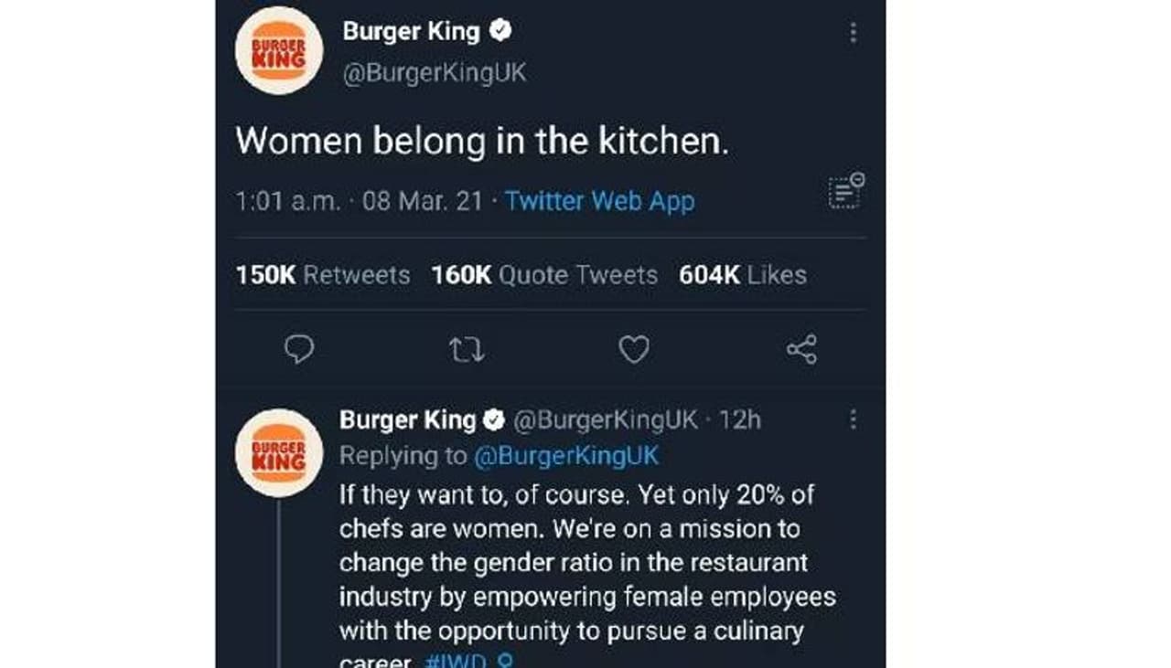 സ്ത്രീകള് അടുക്കളയില് ഒതുങ്ങേണ്ടവരാണ് എന്ന ട്വീറ്റിന് ക്ഷമ പറഞ്ഞ് ഫാസ്റ്റ് ഫുഡ് സ്ഥാപനമായ ബര്ഗര് കിങ്. തങ്ങള് പുതുതായി ആരംഭിക്കുന്ന സ്കോളര്ഷിപ്പിന്റെ ഭാഗാമായി വനിതാ ദിനത്തിലാണ് വിവാദമായ ഈ ട്വീറ്റ് ബര്ഗര് കിങ് പോസ്റ്റ് ചെയ്തത്.