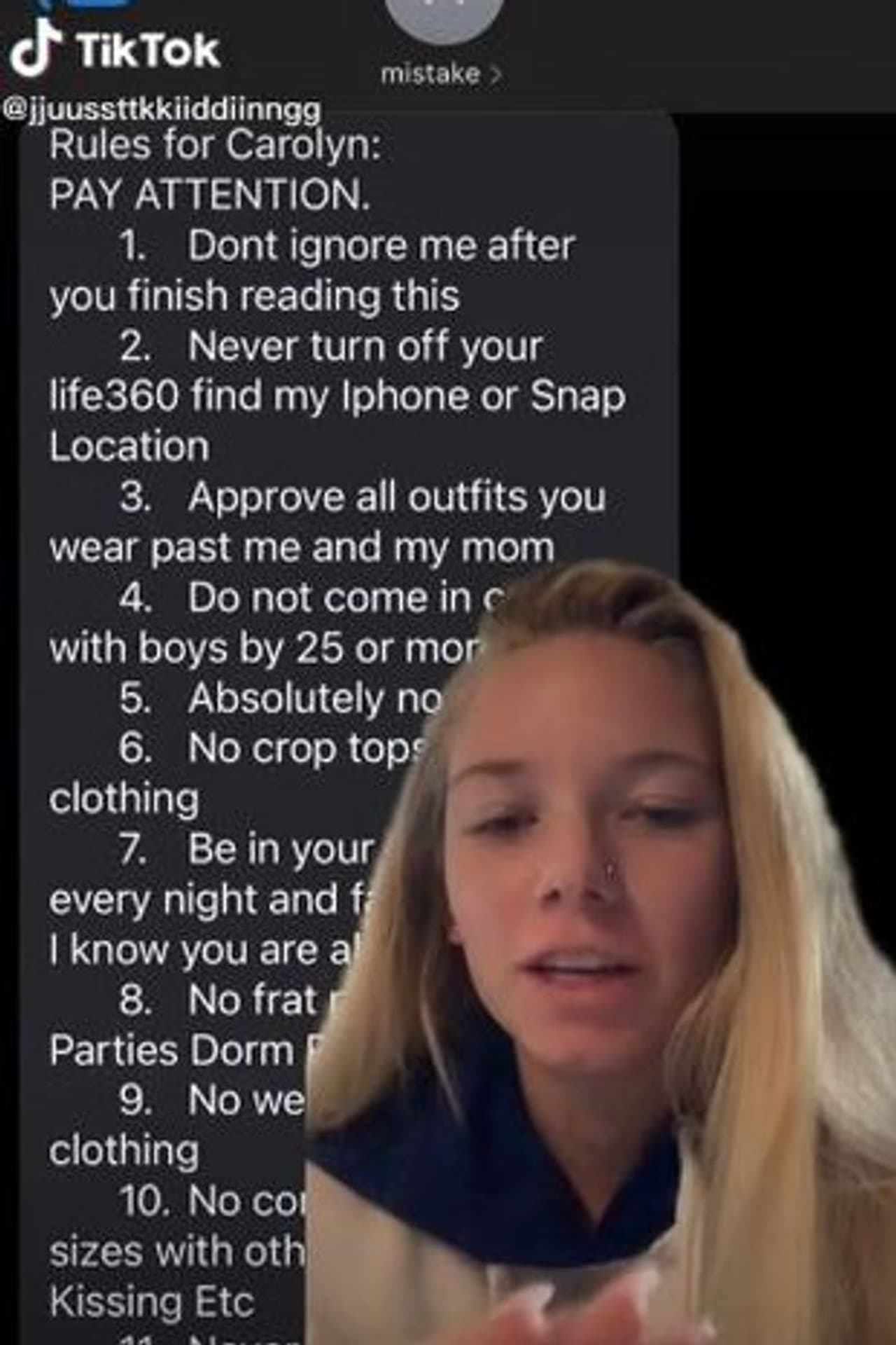 കാമുകിമാരെ വല്ലാതെ നിയന്ത്രിക്കാൻ ശ്രമിക്കുന്ന 'കലിപ്പ'ന്മാർ നമ്മുടെ നാട്ടിൽ മാത്രമല്ല ഉള്ളത്, അങ്ങ് അമേരിക്കയിലുമുണ്ട്. കോളേജിൽ നല്ലൊരു കോഴ്സിന് അഡ്മിഷൻ കിട്ടി മറ്റൊരു നഗരത്തിലേക്ക് പഠിക്കാൻ പോവുന്ന തന്റെ കാമുകിക്ക് (Girl Friend) വിചിത്രമായ 11 കല്പനകളുടെ ഒരു പട്ടിക തന്നെ അയച്ചു നൽകിയിരിക്കുകയാണ് അമേരിക്കയിലെ ഒരു 'കലിപ്പൻ' യുവാവ്. കരോളിൻ എന്ന് പേരായ യുവതി ടിക്ടോക്കിലൂടെ (Tik Tok) ഈ കല്പനകളുടെ ഒരു സ്ക്രീൻഷോട്ട് പങ്കുവെച്ചതോടെയാണ് വിവരം പുറത്തറിയുന്നത്. അനാവശ്യമായ നിയന്ത്രണങ്ങളാണ് ഈ നിർദേശങ്ങളുടെ രൂപത്തിൽ കാമുകൻ (Boy Friend) തന്റെ മേൽ അടിച്ചേൽപ്പിക്കാൻ ശ്രമിക്കുന്നത് എന്നും യുവതി സോഷ്യൽ മീഡിയയിലൂടെ പരാതിപ്പെട്ടു. മിറർ പത്രമാണ് ഈ കല്പനകളുടെ ലിസ്റ്റും വാർത്തയും പ്രസിദ്ധപ്പെടുത്തിയത്.
