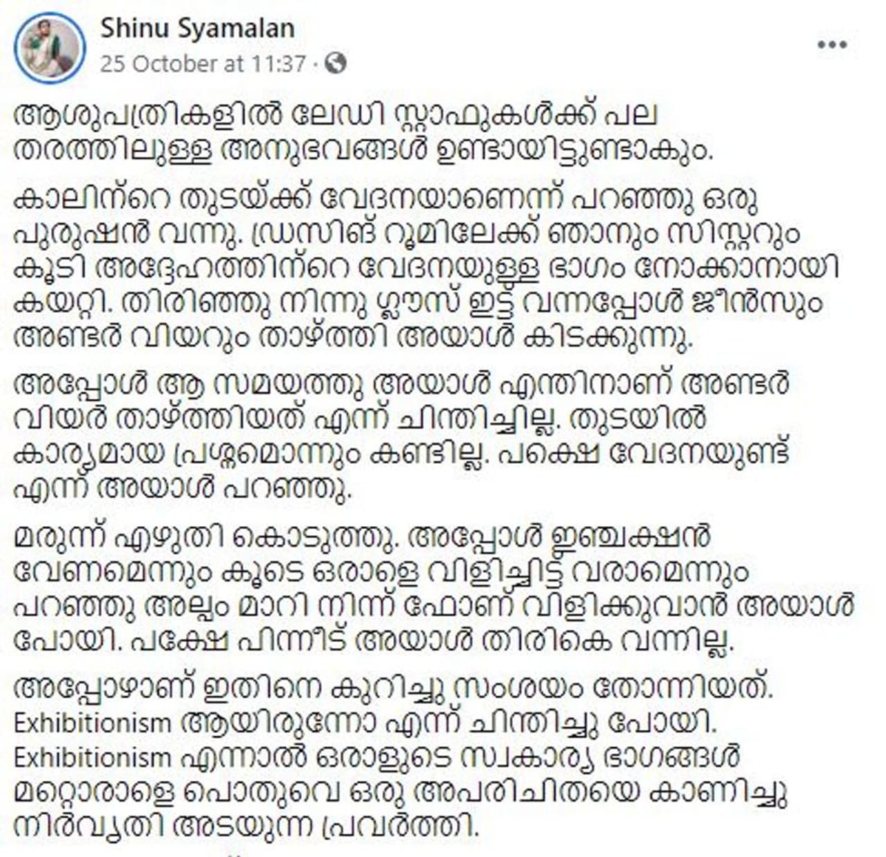 ഡോ. ഷിനു ശ്യാമളന്റെ പോസ്റ്റിന്റെ പൂർണ രൂപം...