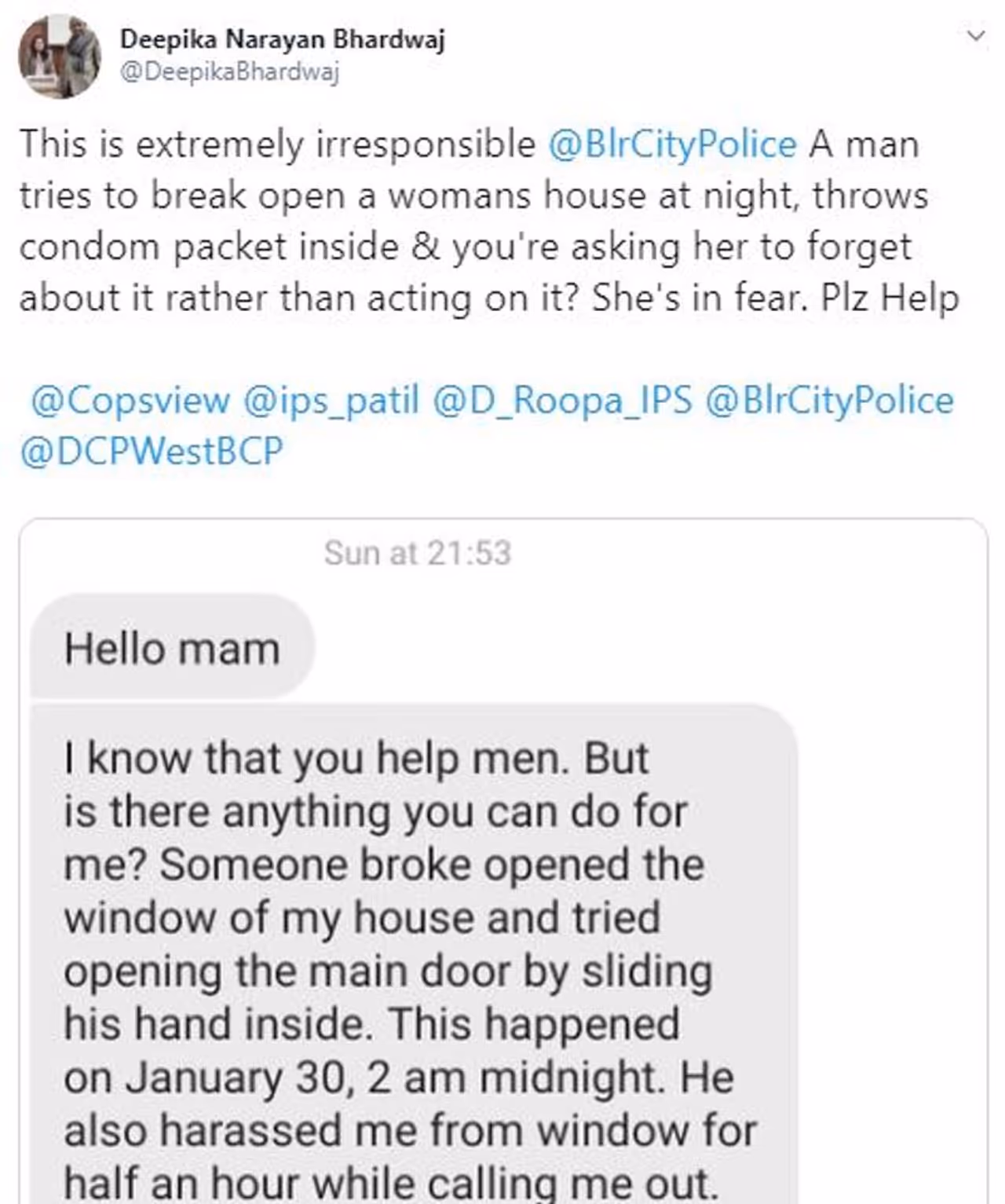 ബെംഗളൂരുവിൽ താമസമാക്കിയിട്ട് നാല് വർഷമായെന്നും ഇത്തരത്തിലൊരു സംഭവം ആദ്യമായിട്ടാണെന്നും ദീപ പറയുന്നു. ഒറ്റയ്ക്ക് താമസിക്കുന്ന ദീപ ഉടൻ തന്നെ 100ൽ ഡയൽ ചെയ്തു. ഏറ്റവും അടുത്തുള്ള പൊലീസ് സ്റ്റേഷനായ പുട്ടനഹള്ളി പൊലീസ് സ്റ്റേഷൻ വീട്ടിൽ നിന്ന് അഞ്ച് മിനിറ്റ് അകലെയാണ്. പൊലീസിനെ വിളിച്ചെങ്കിലും ആരും സ്ഥലത്തെത്തിയില്ലെന്ന് ദീപ പറഞ്ഞു.