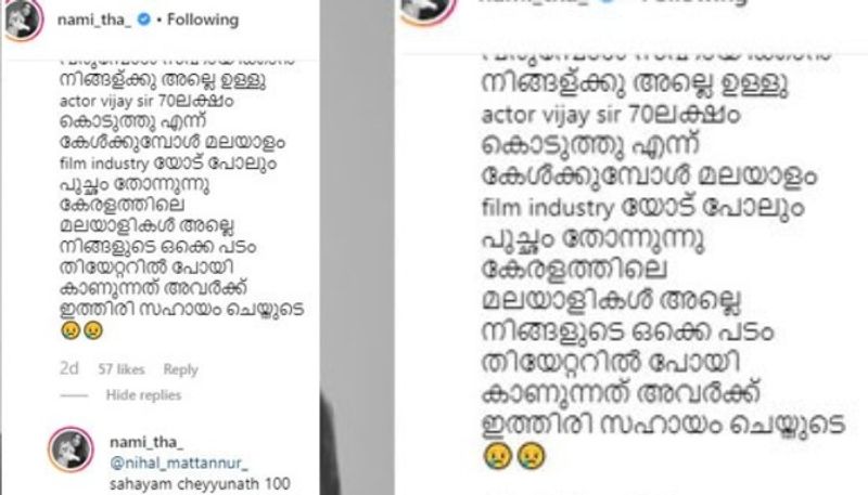 'നിങ്ങളൊക്കെ ജീവിച്ചിരിപ്പുണ്ടോ , കേരളത്തിന് ഒരു പ്രളയം അല്ലെങ്കില് പ്രശ്നം വരുമ്പോള് സഹായിക്കാന് നിങ്ങളൊക്കെ അല്ലേയുള്ളൂ. നടന് വിജയ് സാര് 70 ലക്ഷം കൊടുത്തു എന്ന് കേള്ക്കുമ്പോള് മലയാളം ഫിലിം ഇന്ഡസ്ട്രിയോട് പോലും പുച്ഛം തോന്നുന്നു. കേരളത്തിലെ മലയാളികള് അല്ലേ നിങ്ങളുടെയൊക്കെ പടം തിയറ്ററില് പോയി കാണുന്നത്. അവര്ക്ക് ഇത്തിരിസഹായം ചെയ്തൂടെ' എന്നായിരുന്നു നമിത ഇന്സ്റ്റഗ്രാമില് പോസ്റ്റ് ചെയ്ത ചിത്രത്തിന് താഴെ വന്ന വിമര്ശനം. ഇതിനാണ് താരം മറുപടി കൊടുത്തത്.