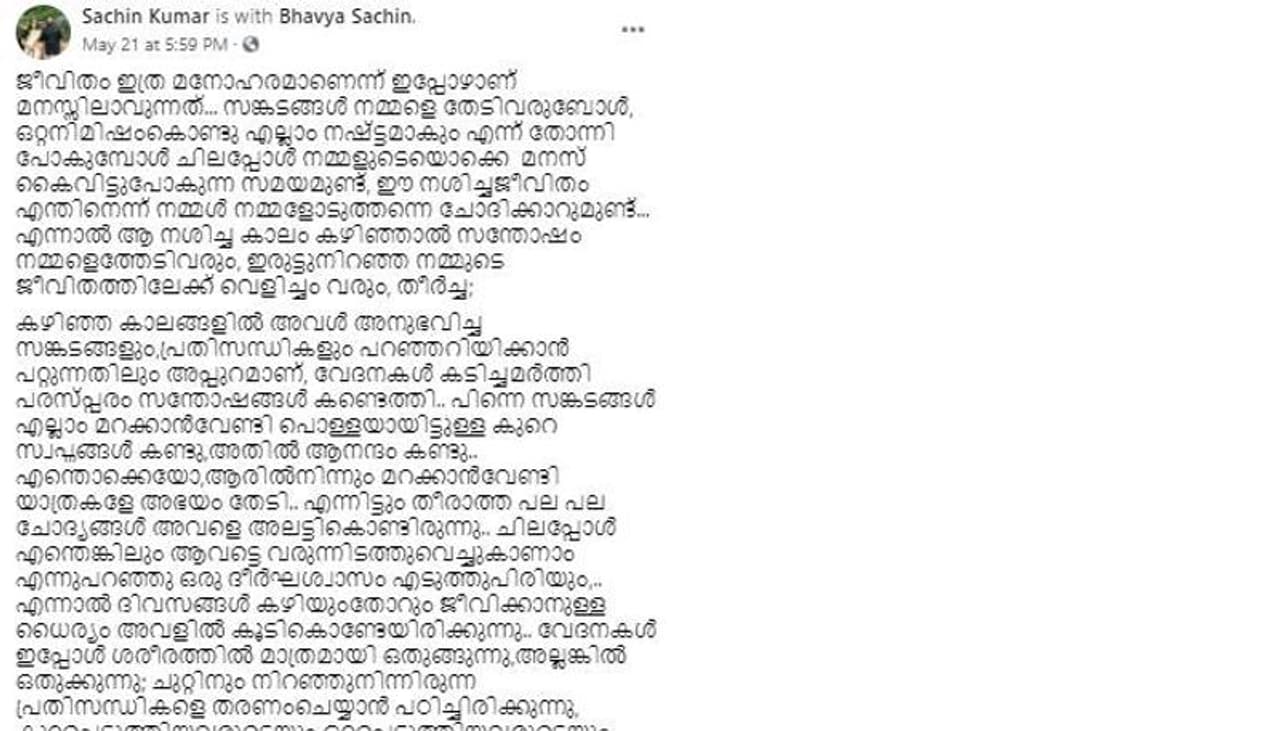 തന്റെ പ്രിയപ്പെട്ടവള് അനുഭവിച്ച വേദനകളെ കുറിച്ച് ഒരു പ്രമുഖ ഫേസ്ബുക്ക് ഗ്രുപ്പില് സച്ചിന് പങ്കുവച്ച കുറിപ്പാണ് ഇപ്പോള് വൈറല് ആകുന്നത്.