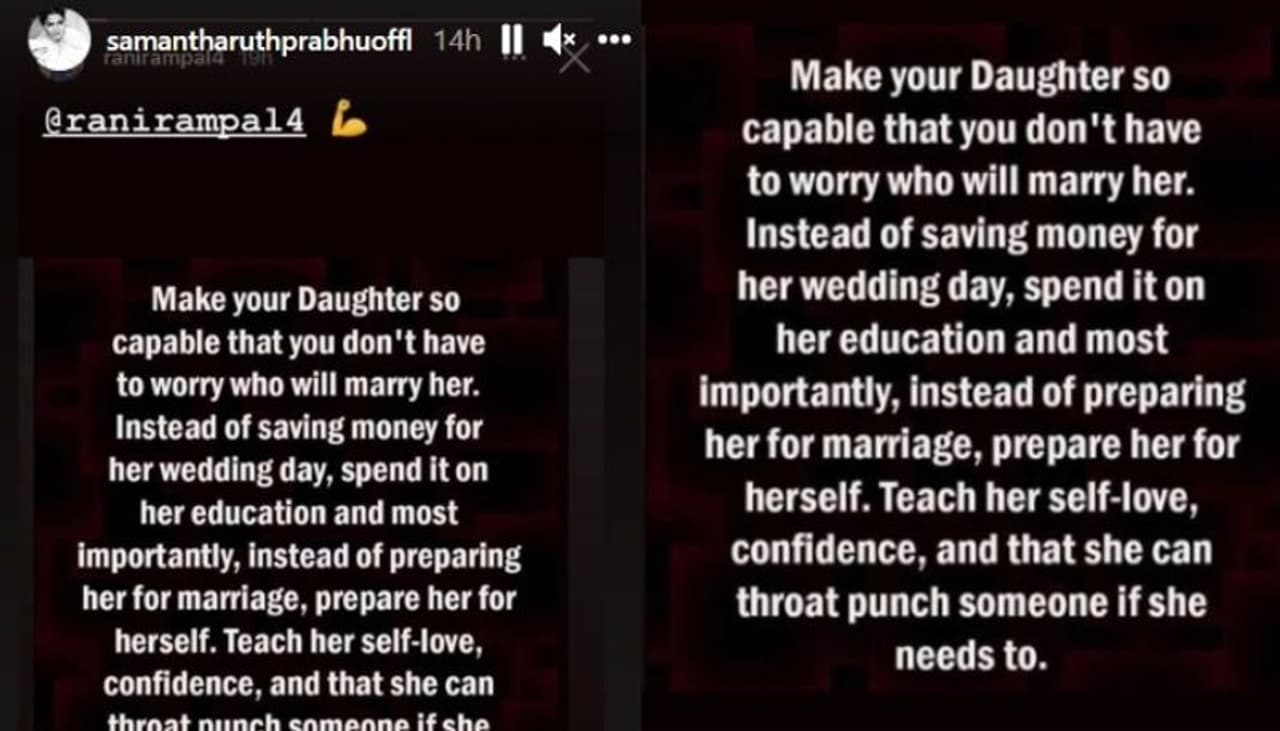 പെൺമക്കളുടെ വിവാഹത്തിന് പണം സ്വരുക്കൂട്ടുന്നതിന് പകരം അതവരുടെ വിദ്യാഭ്യാസത്തിനായി വിനിയോഗിക്കൂ എന്നാണ് പോസ്റ്റില് പറയുന്നത്. അവളെ വിവാഹത്തിന് പ്രാപ്തയാക്കുന്നതിന് പകരം അവളെ അവൾക്കു വേണ്ടി ജീവിക്കാൻ പ്രാപ്തയാക്കൂ എന്നും സാമന്ത പോസ്റ്റിലൂടെ പറയുന്നു.