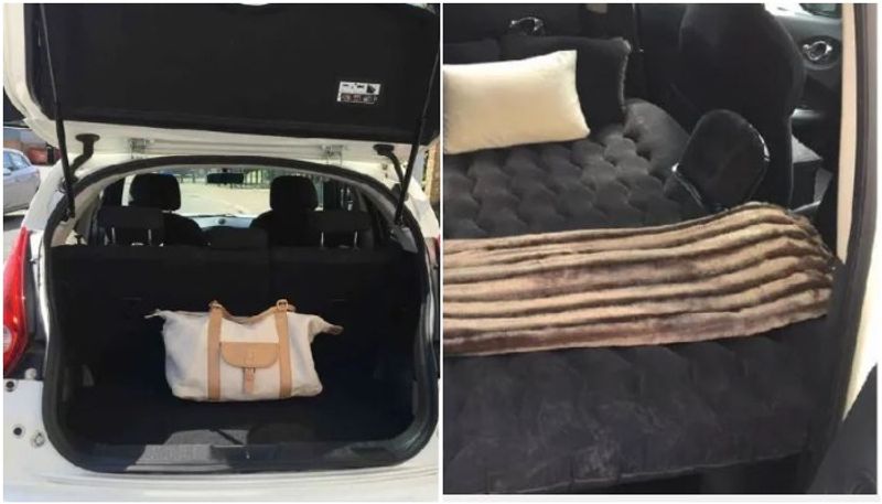 ചെറിയൊരു കിടക്ക, തുണി വിരിക്കാനുള്ള ഹാങ്ങര്, കൂളര് ബാഗ്, കുഷ്യന്സ് എന്നിവയെല്ലാമുണ്ട് കാര് മുറിയില്...