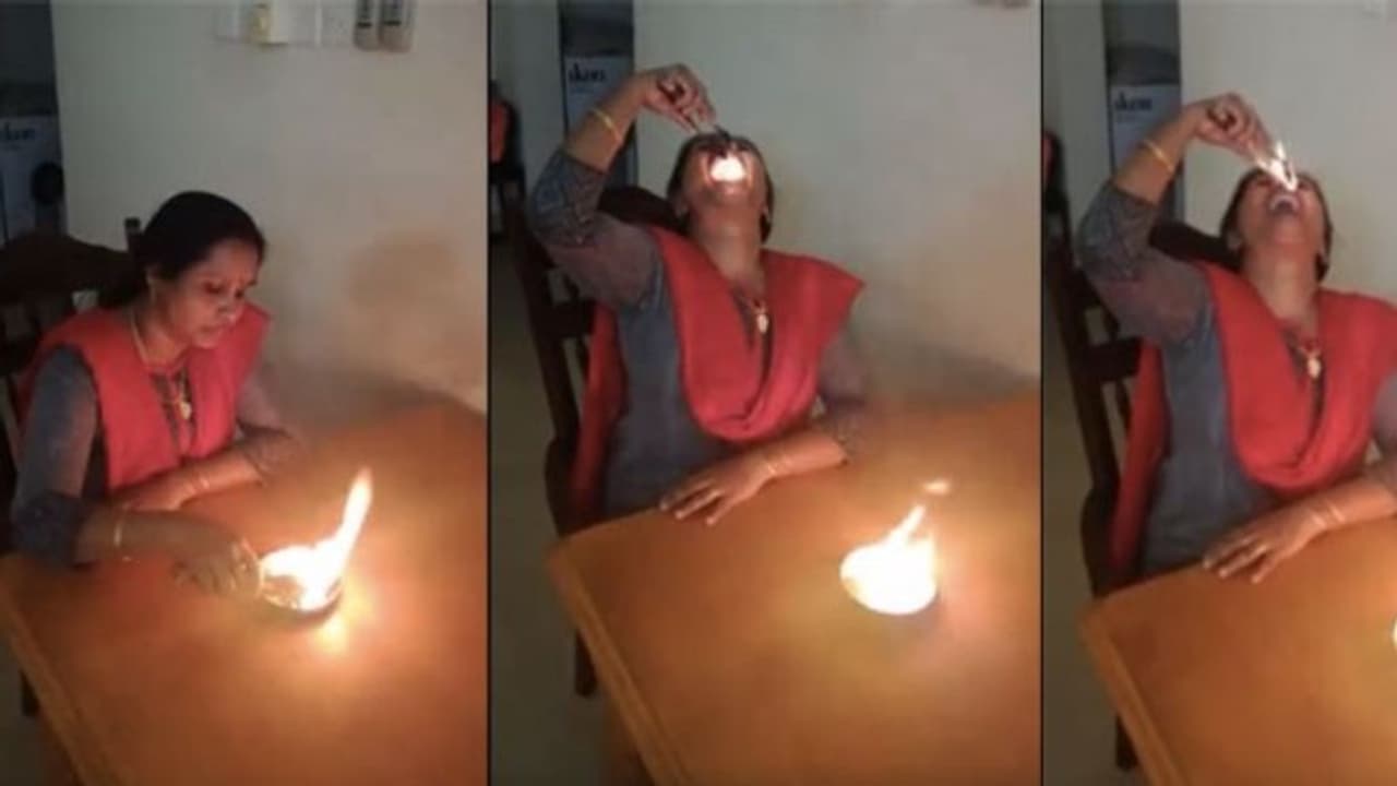 വീട്ടിലെ പെണ്ണുങ്ങള് തീ തിന്നാണ് ജീവിക്കുന്നത് എന്ന് പറയുന്നത് വെറുതേയല്ല എന്ന് തോന്നിപ്പിക്കുന്ന ഒരു വീഡിയോയാണ് ഇപ്പോള് സോഷ്യല് മീഡിയയില് വൈറലാകുന്നത്. ജീവിതത്തിന്റെ കഷ്ടപാടുകളെ കുറിച്ച് , ഓരോ ദിവസവും തള്ളി നീക്കാന് പാടുപ്പെടുന്നതിനെ പറ്റിയൊക്കെ പറയാനായി നമ്മുടെ പെണ്ണുങ്ങള് പ്രയോഗിക്കുന്ന 'തീ തിന്നല്' തന്നെയാണ് ഇവിടത്തെയും വിഷയം. എന്നാല് ചെറിയ ഒരു വ്യത്യാസം ഉണ്ട്. ഇവിടെയൊരു വീട്ടമ്മ അങ്ങോട്ട് ചെന്ന് തീ തിന്നുകയാണ്.