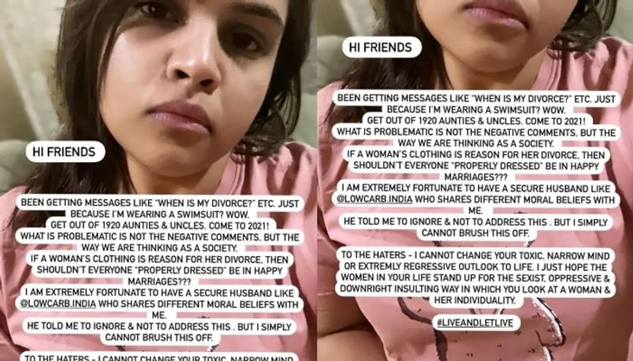 'സ്വിംസ്യൂട്ട് ധരിച്ചു എന്നതുകൊണ്ടു മാത്രം വിവാഹമോചനം എന്നാണെന്ന് പരലും ചോദിക്കുന്നു. 1920 അമ്മാവന്മാരും അമ്മായിമാരും പുറത്തുപോകൂ. 2021ലേയ്ക്ക് വരൂ. നെഗറ്റീവ് കമന്റുകളല്ല, മറിച്ച് ഒരു സമൂഹം എന്ന നിലയ്ക്ക് ഇവര് ചിന്തിക്കുന്ന രീതികളാണ് പ്രശ്നം. ഒരു സ്ത്രീയുടെ വസ്ത്രമാണ് വിവാഹമോചനത്തിന് കാരണമെങ്കിൽ ശരിയായ വസ്ത്രം ധരിക്കുന്നു എന്നു പറയപ്പെടുന്നവരെല്ലാം സന്തുഷ്ട വിവാഹജീവിതം നയിക്കേണ്ടേ ?'- വിദ്യുലേഖ ചോദിക്കുന്നു.