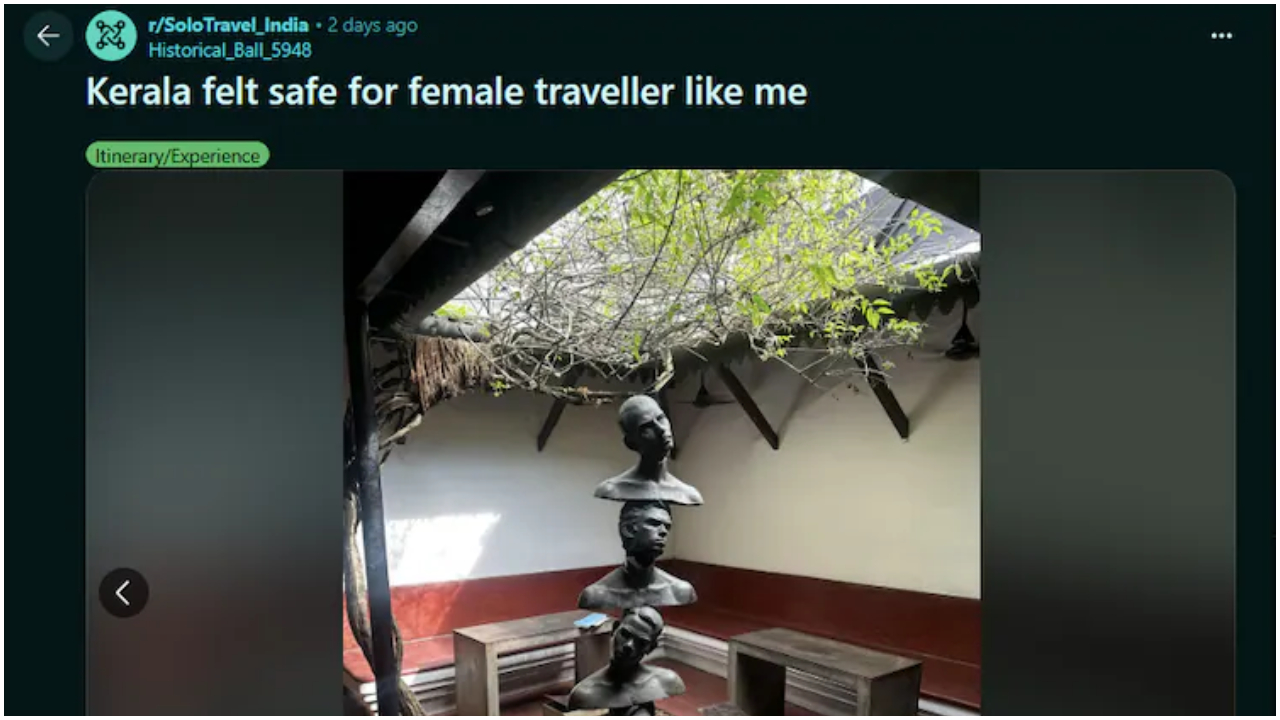യാത്രകൾ എന്നത് എപ്പോഴും സ്പെഷ്യലാണ്. മനസ്സിനെ സ്വതന്ത്രമായി തുറന്നുവിടാനും സുരക്ഷിതത്വത്തിന്റെ ചിറകുകൾ നഷ്ടപ്പെടാത്ത പുതിയ ഇടങ്ങൾ കണ്ടെത്താനുമുള്ള ശ്രമങ്ങളുടെ ഭാഗം കൂടിയാണ് യാത്രകൾ. ഇപ്പോൾ ഇതാ ഒരു വനിതാ സഞ്ചാരി തന്റെ കേരള യാത്രയെ കുറിച്ച് റെഡ്ഡിറ്റിൽ (r/SoloTravel_India) പങ്കുവെച്ച അനുഭവങ്ങൾ ശ്രദ്ധേയമാകുകയാണ്. തന്നെ പോലെയുള്ള സ്ത്രീ യാത്രക്കാർക്ക് കേരളം സുരക്ഷിതമാണെന്ന് അവർ പറഞ്ഞു. സ്ത്രീ യാത്രക്കാർക്ക് കേരളം എത്രത്തോളം സുരക്ഷിതമാണെന്ന് അടിവരയിടുന്ന പ്രതികരണമാണിത്.
